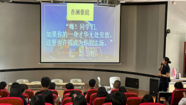 下午1点半,安庆香澜豪庭酒店、安庆世纪缘国际酒店、合肥丰大国际酒店等十家企业进场宣讲,每个酒店都对自己岗位需求、企业文化以及学生关心的职业发展、食宿安排等方面做了详细的介绍。
