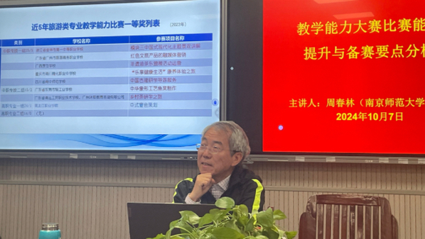 10月7日下午,管理服务学院邀请南京师范大学地理科学学院旅游系教授周春林(原南京旅游职业学院党委书记),为学院中青年教师开展了《教学能力大赛比赛能力提升与备赛要点分析》专题讲座。