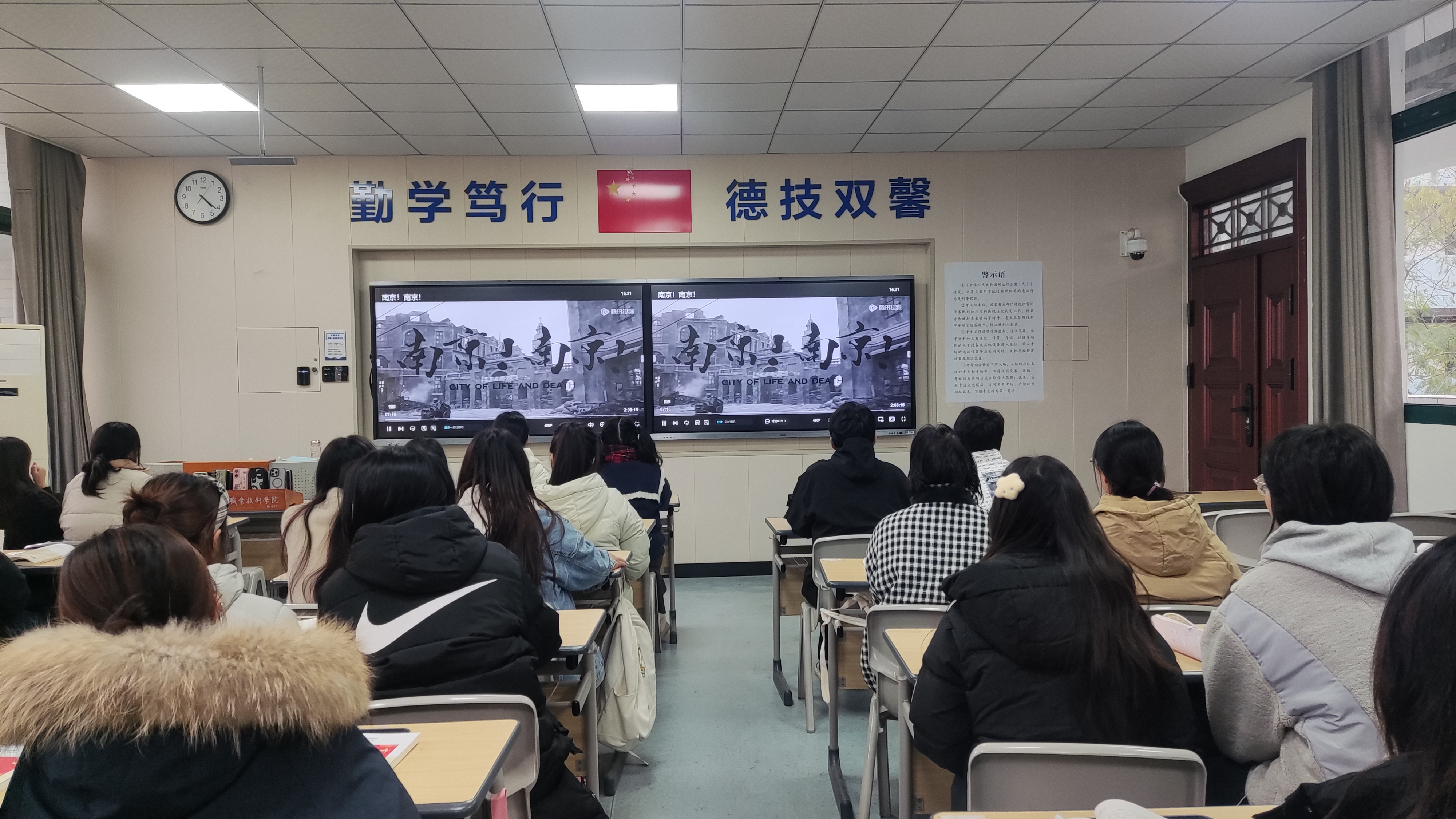 12月12日晚,各班级在教室开展了集中观影活动,观看了《南京!南京!》等红色题材影片。电影《南京!南京!》以1937年的南京大屠杀为背景,通过生动的画面和感人的情节,将那段血腥的历史再次呈现在观众面前,让人深刻感受到了战争的残酷和人性的光辉。影片中那些惊恐的呼喊声和不绝于耳的枪声,让大家近距离回顾抗日战争期间南京大屠杀那段令中华民族饱经沧桑的屈辱历史,激发学生的爱国情怀和报国之志。观影结束后,大家深感今天和平幸福的来之不易,很多学生还写下了观影心得,他们纷纷表示要时刻牢记历史、勿忘国耻、珍爱和平,以实际行动为实现中华民族的伟大复兴贡献青春力量。