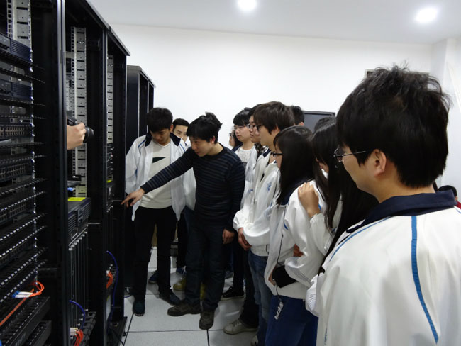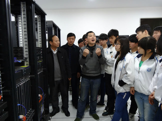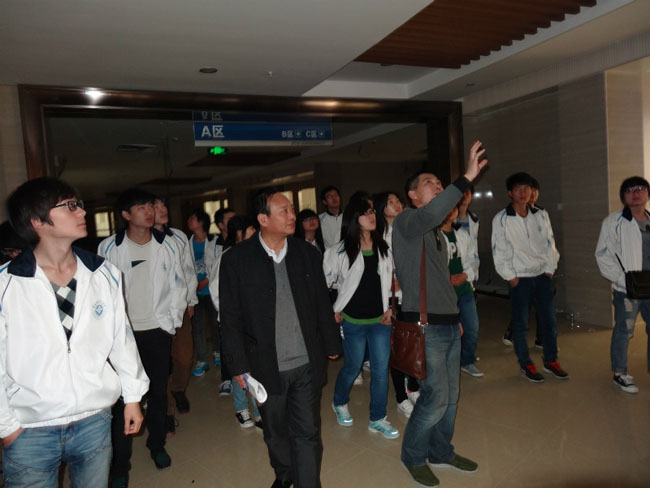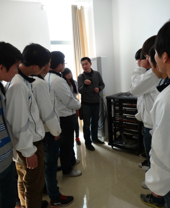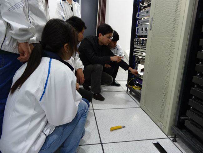 在实习现场,巩绪林老师等为同学们分别讲解了政务服务中心综合布线系统、计算机网络系统、公共广播、背景音乐及会议系统、多媒体信息发布系统、中心机房综合业务平台服务器存储系统、安防报警系统、中心标准化桌面终端信息平台等信息化平台建设管理八个部分的设计、实施等技术问题。同学们认真聆听讲解,热情参与讨论,与项目现场和设备“零距离”接触,对于工程施工有了一次深入的认识。