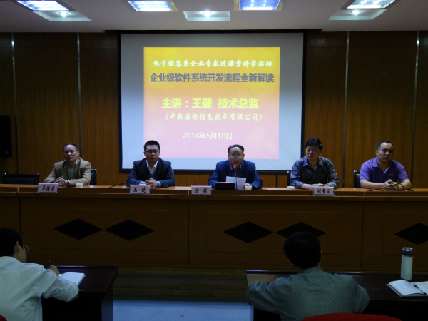 为了让专业课教师进一步了解现代企业真实软件项目开发流程,推动教学理念和教学方法改革创新,5月10日,电子信息系特邀了中软国际信息技术有限公司技术总监、资深项目开发专家王建工程师来到8040威尼斯,为我院师生作题为《企业级软件系统开发流程全新解读》的学术报告。报告会在图文信息中心三楼报告厅举行,电子信息系主任方莉主持报告会,近三百名师生聆听了报告。