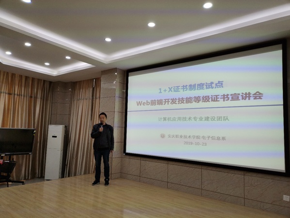 2019年10月23日下午,电子信息系组织18级计算机应用技术专业200多名学生参加1+X证书制度试点“Web前端开发”技能等级证书宣讲会,会议由熊祖涛老师主持,王奇志老师担任主讲。