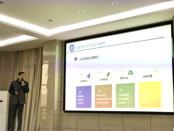 物联网应用技术专业建设负责人从“1+X证书制度介绍”、“传感网应用开发证书说明”、“目前工作开展情况”和“下一步工作安排”等四个方面对1+X证书及培训考证安排进行了详细的解读和说明。