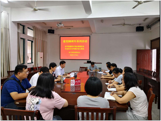 为庆祝中国共产党成立99周年,进一步扎实推进“不忘初心、牢记使命”主题教育常态化制度化,电子信息系党总支于7月6日在党员活动室开展庆祝建党99周年系列活动之党课学习。党课由党总支副书记李跃花主讲,全体党员参加。