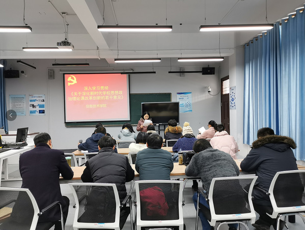 12月4日,信息技术学院党总支召开全体党员学习会,深入学习贯彻中共中央办公厅、国务院办公厅《关于深化新时代学校思想政治理论课改革创新的若干意见》和《新时代高校教师十大行为准则》,全体党员老师参加会议。