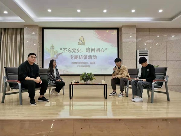 4月21日18:30,信息技术学院党总支、团总支在2栋216室开展党史学习教育系列活动之“不忘党史追问初心”专题访谈活动。2018级的优秀中共预备党员王博、徐林勇、金梦昀为信息技术学院入党积极分子分享自己与党的故事,追忆自己的入党初心。
