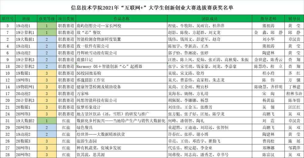 根据省教育厅《关于举办第七届安徽省“互联网+”大学生创新创业大赛的通知》及校“互联网+”双创大赛办公室的要求,6月25日晚上,信息技术学院举办了“互联网+”大学生创新创业大赛选拔赛。在200余项报名作品中,经辅导员和指导教师推荐,共有32支队伍入围现场选拔赛路演,经评委打分,评选出20件作品分获一、二、三等奖,并推荐其参加校赛,具体名单如下: