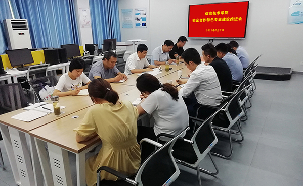 为推进校企深度合作,提高专业共建质量,7月7日下午,信息技术学院在2号教学楼205教室组织召开校企合作特色专业建设推进会。学院党总支班子成员,内设机构负责人,专业建设负责人,以及合作企业天津迅腾科技、安徽辰夫科技代表参加了会议,会议由学院党总支书记、院长疏国会教授主持。
