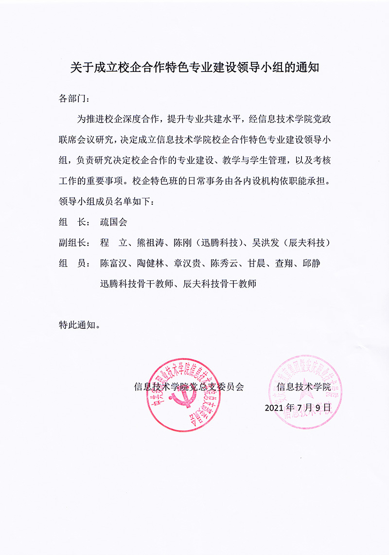 信息技术学院关于成立校企合作特色专业建设领导小组的通知