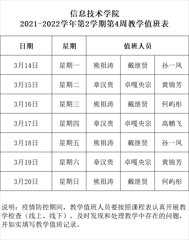信息技术学院2021-2022学年第2学期第4周教学值班表
