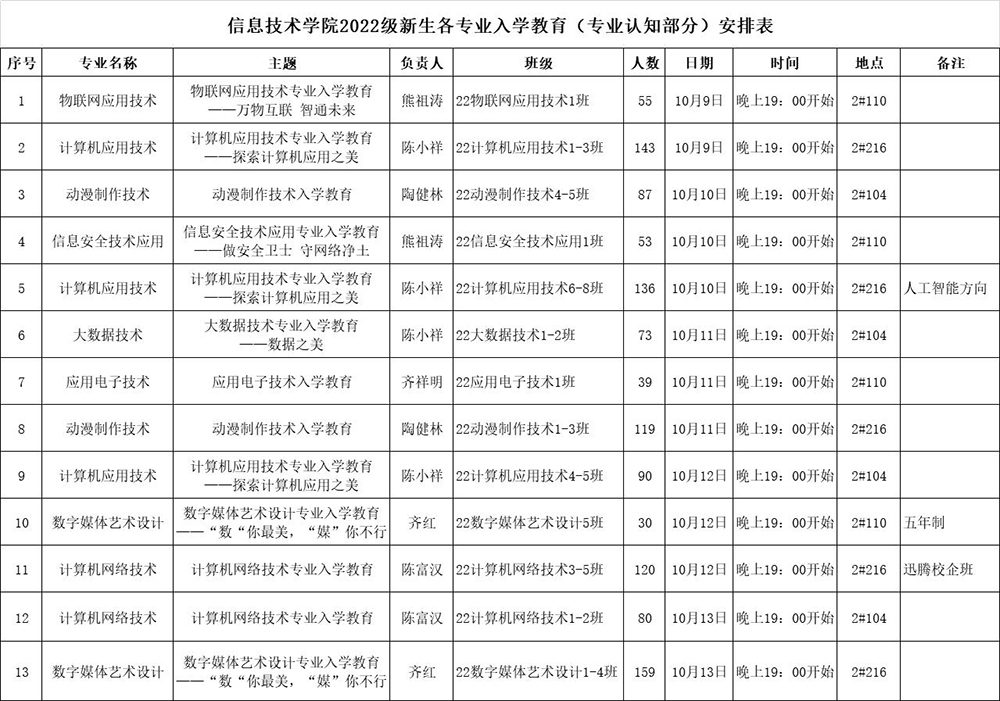 2022级新生各专业入学教育(专业认知部分)安排表