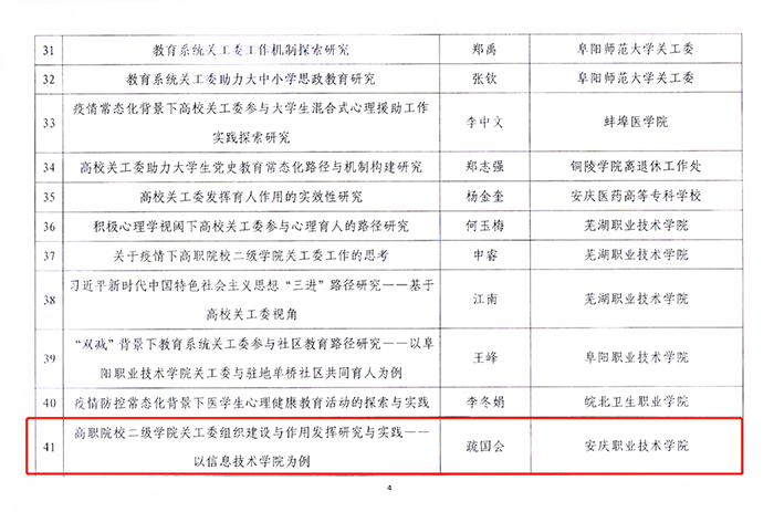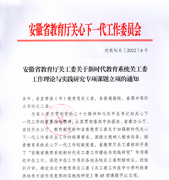 近日,安徽省教育厅关心下一代工作委员会公布了《关于新时代教育系统关工委工作理论与实践研究专题课题立项的通知》,信息技术学院疏国会教授主持申报的《高职院校二级学院关工委组织建设与作用发挥研究与实践》获批立项。