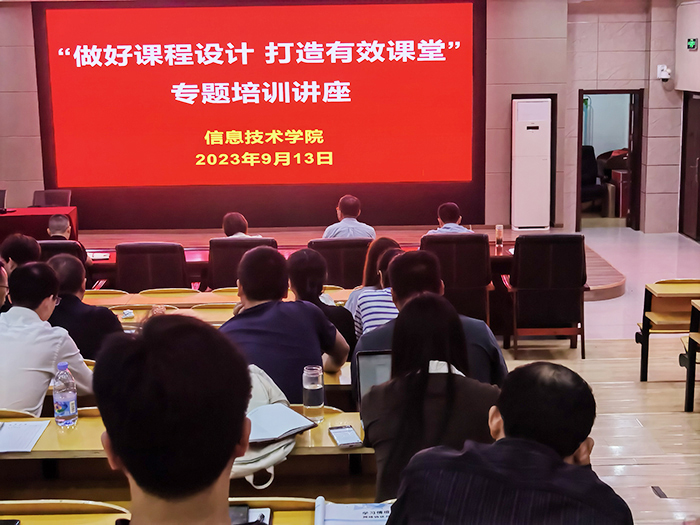 为进一步加强教学质量管理,提高教师教学能力与教学水平,帮助教师做好课程设计,打造有效课堂,9月13日下午,信息技术学院在2号教学楼信仰报告厅开展教学督导集中反馈暨“做好课程设计打造有效课堂”专题培训活动。校外督导专家吴跃虎教授就上学期的督导听课情况进行了集中反馈,专题培训阶段由计算机应用技术和大数据技术专业建设负责人陈小祥老师担任主讲,全体教师参加学习,活动由信息技术学院副院长熊祖涛主持。