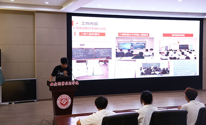 会上各班级团支部书记通过PPT展示汇报的方式进行一学年工作总结。各班级团支部书记从智慧团建系统的录⼊与维护、“三会两制⼀课”、团日活动、团课、青年⼤学习情况等有关团支部建设和团员思想引领方面的工作进行全面回顾和总结。在分享成绩和经验的同时,也查找不足,并对接下来的团支部工作进⾏了具体规划和安排。院团总支书记杜青老师对团支部书记⼯作情况和述职报告进⾏点评,对各班团支部工作取得的成绩给予肯定,就存在的问题进行了针对性指导,强调各团支部团干们应通力合作,不断加强学习,增强政治敏锐性和政治鉴别⼒,做好党的助⼿,弘扬主旋律;鼓励各团支部丰富团日活动形式,打造支部特色和亮点,发挥优势,勇于创新,再创佳绩。