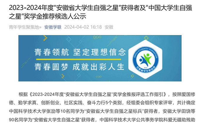 据悉,本次评选是根据《2023-2024年度“安徽省大学生自强之星”奖学金推报评选工作指引》,按照爱国修德、勤学求真、创新创业、社区实践、奋斗力行5个类别,经组委会组织专家评审,共计确定中国科学技术大学张劢等10名同学为“安徽省大学生自强之星标兵”获得者,安徽大学田饶等90名同学为“安徽省大学生自强之星”获得者荣誉称号。