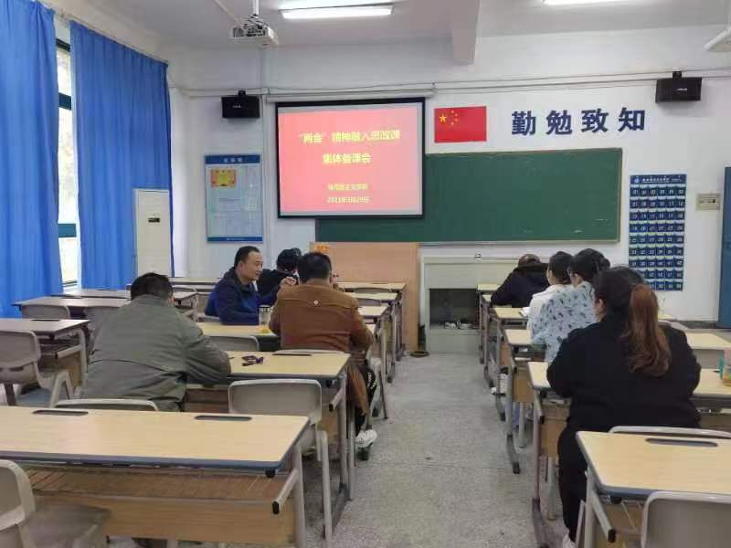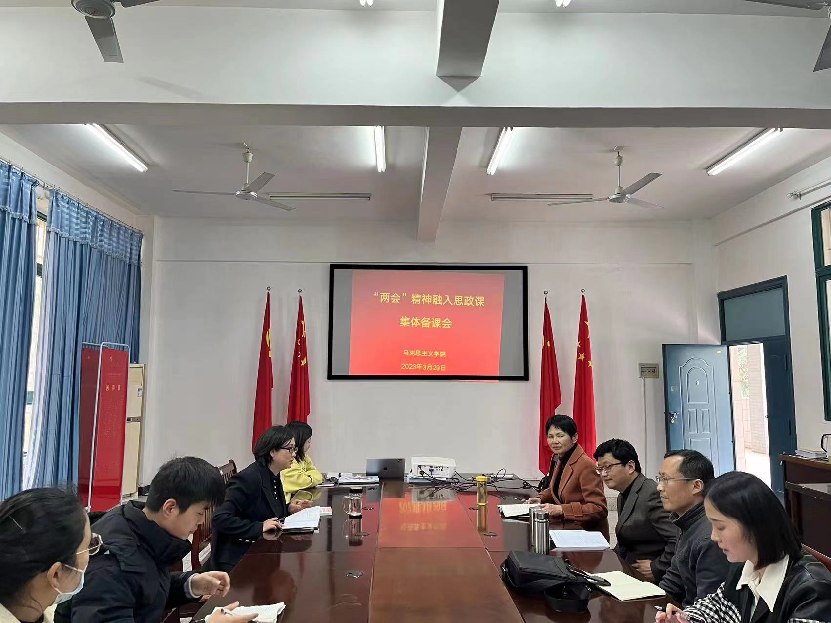 为全面贯彻党的教育方针,落实立德树人的根本任务,重温习近平总书记在学校思想政治理论课教师座谈会的重要讲话精神,持续增强思政课的时效性,马克思主义学院组织《习近平新时代中国特色社会主义思想概论》、《毛泽东思想和中国特色社会主义理论体系概论》等课程组分别召开了“两会”精神融入思政课集体备课会。全体思政课教师参与集体备课会。