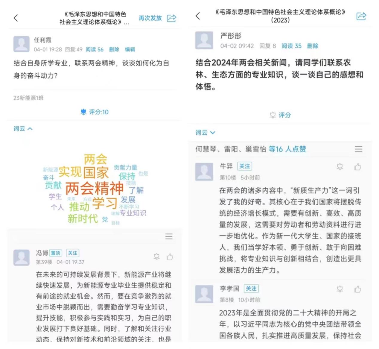 思政课教师以课堂为主阵地,以青年大学生关心关注的热点趣点为切入口通过学习通发布线上主题讨论,积极引发学生思考,提升了学生的参与度,实现了将会议精神的学习与大学生的学习生活、未来职业规划相结合,引导大学生了解国内外形势,关注国事、关心民生、激发爱国情怀,结合自身所学专业,以实际行动将会议精神化为自身的奋斗动力,切提升思政课与专业课协同育人成效