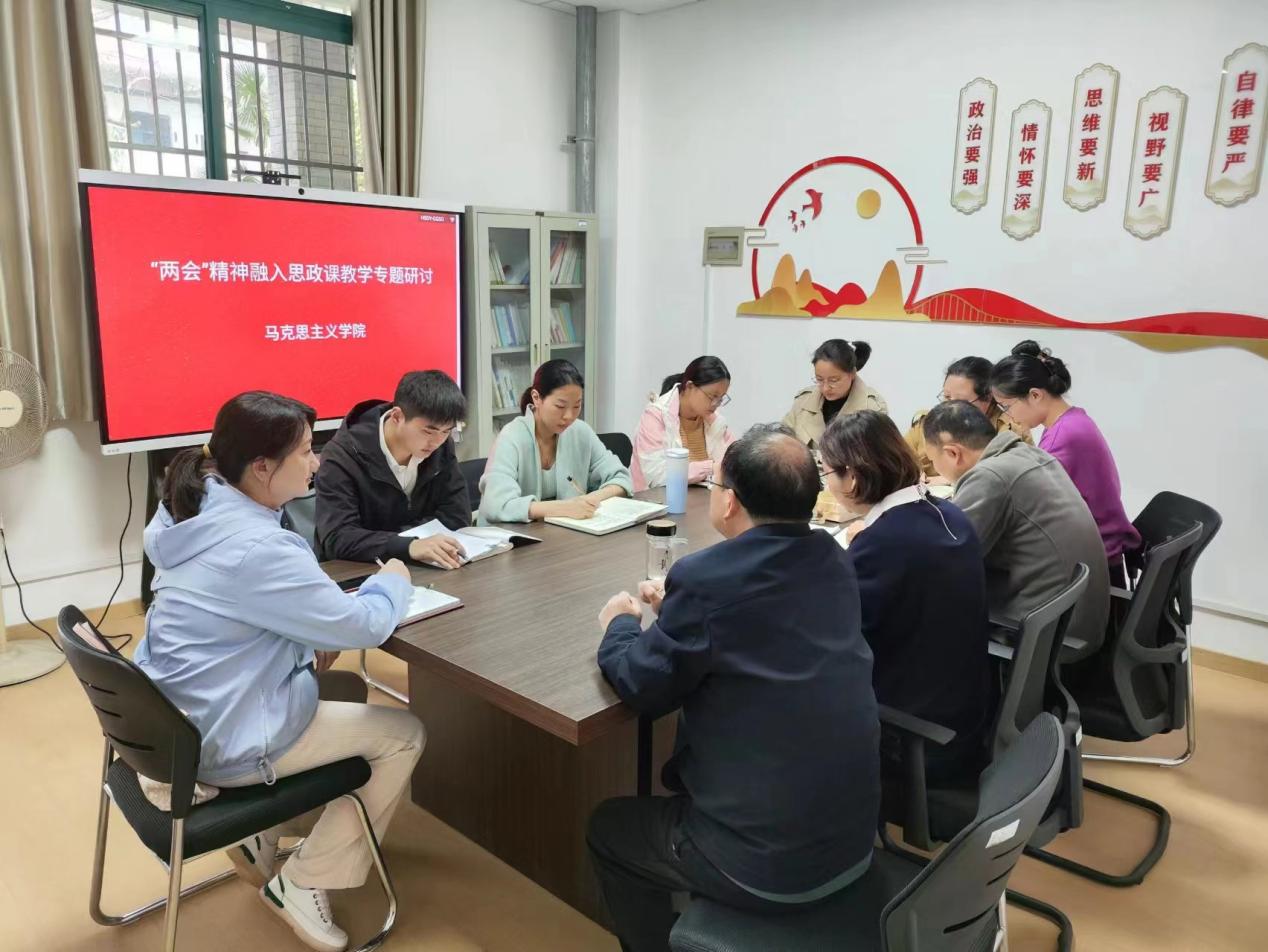 思政课是落实立德树人根本任务的关键课程。为把全国“两会”精神第一时间融入思想政治理论课,发挥思政课在思想政治教育的主渠道作用,马克思主义学院组织教师召开专题研讨,老师们在聚焦时政热点的同时,结合授课内容,对如何推进“两会”精神进课堂,打造兼具理论深度、实践力度和情感温度的思政课阐述了自己的观点和思路。