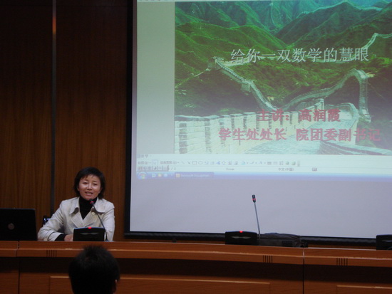 10月30日晚,我院2008——2009学年度第一学期“科学、人文、艺术素质教育系列讲座”讲座继续进行,院学生处处长、团委副书记高润霞老师做“给你一双数学的慧眼”专题讲座。高处长结合生动的案例,从“用数学的眼光看游戏”、“用数学的眼光看人生”、“用数学的眼光看艺术”、“用哲学的眼光看数学”和“用艺术的眼光看数学”等方面,展示数学的魅力,引导学生一起尝试着用数学的眼光去理解一些事物,鼓励学生结合自身的专业特点,学好并运用好数学,用数学的一双慧眼去发现和寻找我们身边更多的精彩。高处长的讲座文理渗透,师生互动,深受学生欢迎。