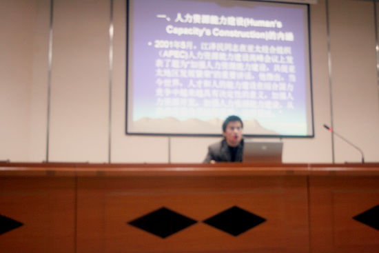11月20日晚,2008——2009学年度第一学期“科学、人文、艺术”素质教育系列讲座在图文信息中心大报告厅继续进行,经济贸易系朱镇斌老师做“论当代大学生人力资源能力建设与创新能力培养”专题讲座,近500名师生到场听课。朱老师从人才和人的能力建设在社会经济发展中的意义、创新人才工程、办学理念的更新、教育管理机制变革和教学培训模式建立等方面论述了当代大学生人力资源能力建设与创新能力培养。