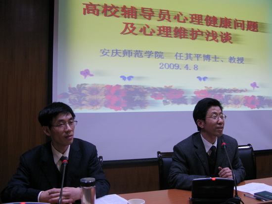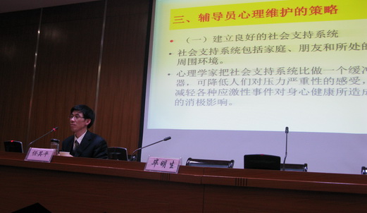 会议特邀安庆师范学院教育学院教授、教育心理学博士任其平做题为“高校辅导员心理健康问题及心理维护浅谈”的专题报告。任教授首先从实证研究和问题描述两个方面剖析了高校辅导员心理健康问题,然后从心理学、社会学等角度分析辅导员心理问题产生的原因,最后,他重点阐述了辅导员心理维护的策略。任教授的报告语言深入浅出,举例生动鲜活,内容丰富而有针对性,使听课的师生受益良多。