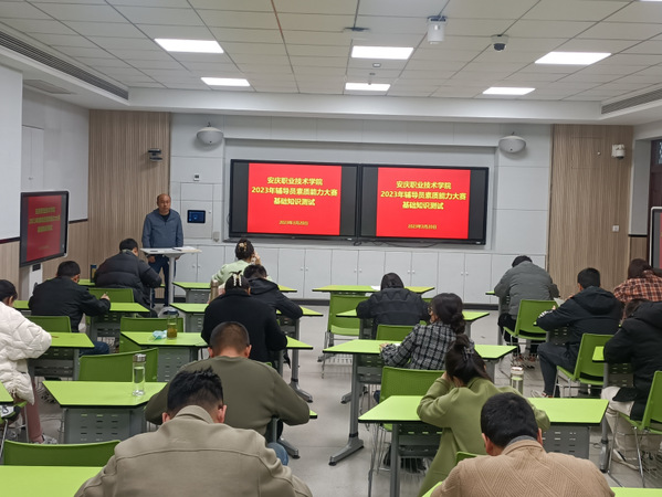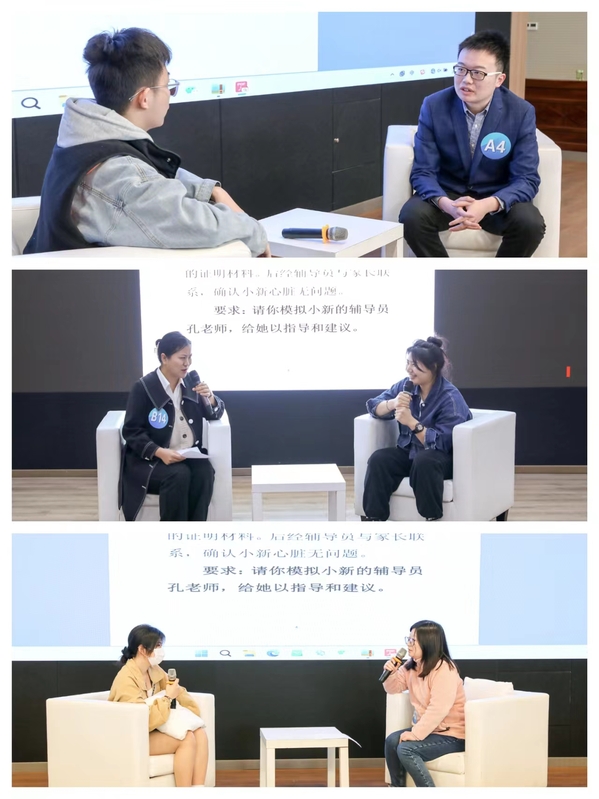 本次比赛全面对标省赛、国赛,分基础知识测试、案例研讨和谈心谈话三个环节进行。其中基础知识测试采用闭卷作答方式,考察选手理论素养和业务知识;案例研讨采用“我提问,你回答”的研讨方式,考查选手综合运用理论分析问题、研判问题、解决问题、应急处突等能力;谈心谈话采用现场真实师生谈话方式,考查选手对学生特征、学生成长成才规律的了解把握程度,对学生的教育引导能力、解决理论困惑和实际问题的能力。