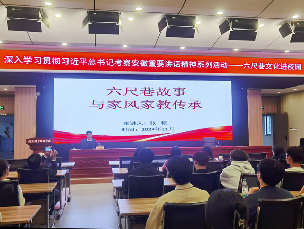 报告会从回顾习近平总书记考察桐城足迹开端,介绍习近平总书记在重温张吴礼让典故,察看桐城历史文化展陈后,提出六尺巷承载着中国古人的历史智慧,要弘扬好中华民族传统美德,相互礼让、以和为贵,解决好民生问题,化解好社会矛盾,让我们的社会更加和谐。随后报告会向全体人员介绍了六尺巷的由来,“父子双宰相”“三代得谥”“四代讲官”“六代翰林”等历史故事和以“礼让”为核心要义的六尺巷文化内涵。介绍了清河张氏以“学”“德”“廉”“俭”“让”为主要特点和麻溪吴氏注重德行修养的优良家风,并提出传承好优良家风具有非常重要的现实意义。最后报告会还详细阐述了以“听、辨、劝、借、让、和”为规程的六尺巷调解工作法和新时代六尺巷工作法具体内涵。整场报告内容丰富、通俗易懂,把哲学道理与身边故事进行了深度融合,对全体师生深入学习贯彻习近平总书记考察安徽重要讲话精神提供了有力指导,报告会气氛热烈,赢得了现场观众的阵阵掌声。