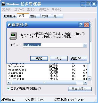“Explore.exe”进程被结束后将会看不到桌面图标和任务栏,这时按住Ctrl+Alt+Del键,启动任务管理器,点击菜单“文件→新建任务(运行)”,输入“explorer.exe”,点击“确定”(见图1)。