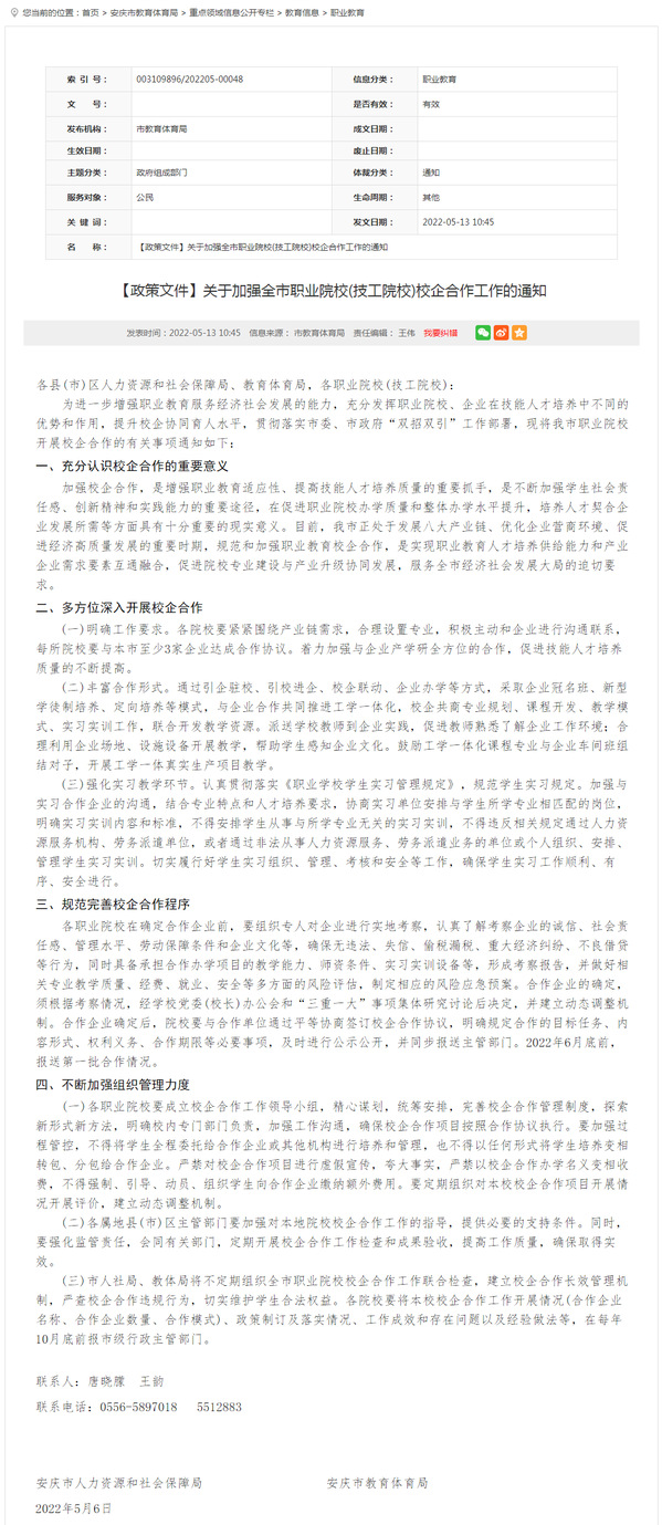为进一步增强职业教育服务经济社会发展的能力,充分发挥职业院校、企业在技能人才培养中不同的优势和作用,提升校企协同育人水平,贯彻落实市委、市政府“双招双引”工作部署,现将我市职业院校开展校企合作的有关事项通知如下: