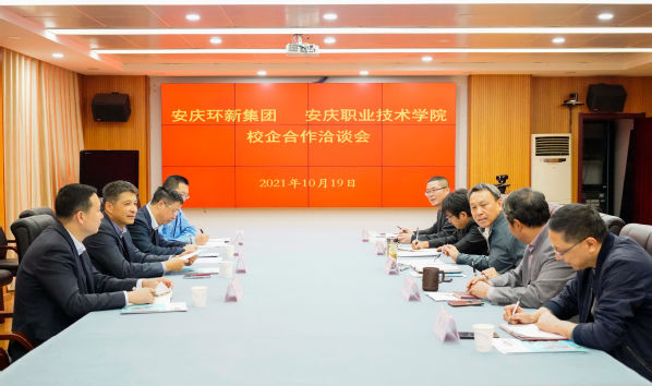10月19日下午,安徽环新集团党委书记、总经理曹立新一行四人来校洽谈校企合作事宜。校党委书记童宏葵出席洽谈会。副校长李克让主持洽谈会,校机电工程学院、招生就业处、校企合作办负责人参加了会议。