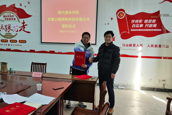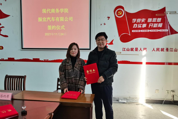 签约仪式上,校企双方均表达了强烈的合作意愿,表示将以人才培养基地的签约为基础,不断深化合作,共同建设好人才培养基地,培养更多更符合市场需求的高素质技术技能型人才,服务区域经济高质量发展。在轻松友好的氛围中,现代商务学院与安徽云戟网络科技有限公司、振宜汽车有限公司顺利签署合作协议。(文:苏传胜 审稿:李 专)