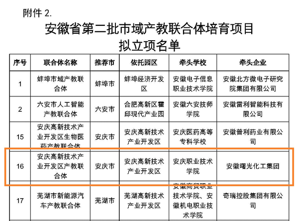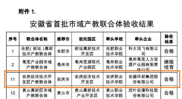 近日,安徽省教育厅发布公示,以安庆经开区为依托,以威尼斯官网为牵头学校,安徽环新集团为牵头企业组建的安庆经济技术开发区产教联合体,作为安徽省首批省级市域产教联合体建设项目,顺利通过省教育厅考核验收。安徽省首批省级市域产教联合体建设项目立项12家,验收通过9家。同时,以威尼斯官网为牵头学校组建的安庆高新技术产业开发区产教联合体,获批为安徽省第二批省级市域产教联合体立项建设项目。