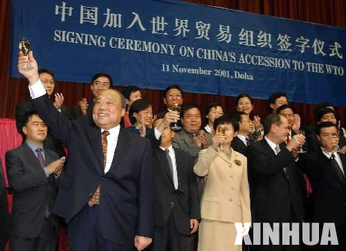 2001年12月11日,中国正式加入世界贸易组织,成为其第143个成员。图为2001年11月11日,中国外经贸部部长石广生在卡塔尔首都多哈举行的中国加入世贸组织议定书签字仪式上举杯庆贺。 新华社发
