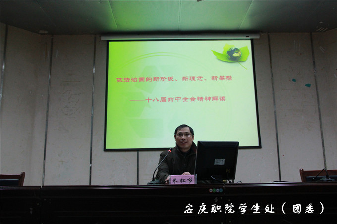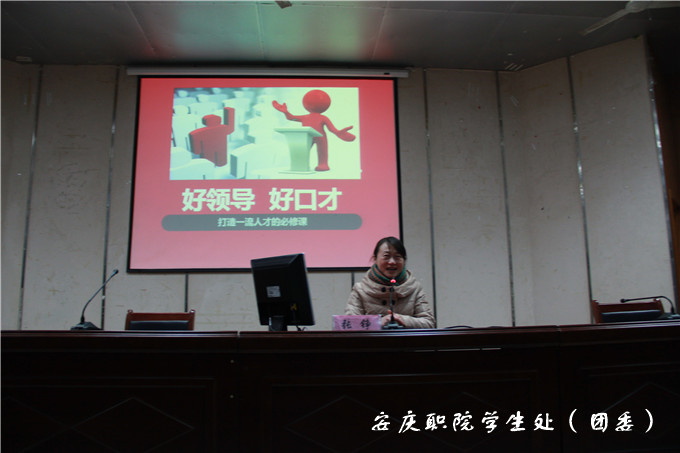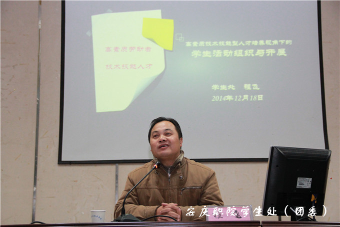 学生处(团委)负责人程飞、公共基础部党总支书记朱松节、教务处副处长储诚炜、心理健康教研室主任张铮,他们在培训期间先后分别以《高素质技术技能型人才培养视角下的学生活动组织与开展》、《十八届四中全会精神解读》、《自媒体时代大学生信息汲取与运用的策略——以新浪微博为例》、《学生干部表达能力的提高》为题从不同角度讲解,集中体现做好一名优秀学生干部必须要不断加强个人道德修养,提升自身综合素质,充实完善自己,发挥团队合作精神,提升领导艺术和管理才能。心理健康中心余慧玲老师组织全体参训人员参加了精心设计的综合素质拓展项目活动,鼓励他们不断提高自身的团队合作能力。整个培训虽然时间不长,但内容丰富,程序紧凑,组织有序,对培养和造就一支政治强、品德优,能力强、学习优的“双强双优”型学生干部队伍打下了坚实的基础。