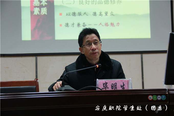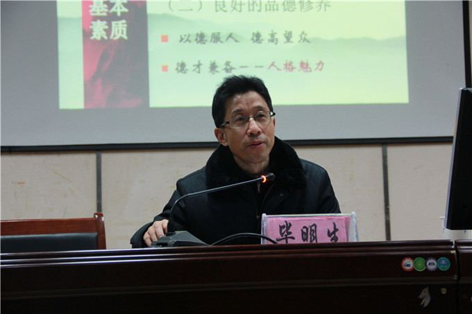 在培训班上,副院长毕明生教授以《学生干部应具备的基本素质》为题做了首场培训讲座。他的讲座主要围绕学生干部的内涵,学生干部在学生中的地位,学生干部的素质如何提升做详细阐述。他在讲话中重点讲述,学生干部是开展学院工作的得力助手,是学生工作得以落实的具体组织者、协调者、运行者。学生干部要做实事、做好事,要有一个端正的积极的态度做事,要有组织能力和团队协作能力,学会组织分配,把学生与干部有机统一,这样才能把事情做好。他在报告中指出:学生干部是学生工作的主力军、优秀学生代表、学生的先行者和组织者,在学院中担当教师和学生之间的桥梁纽带。因此,学生干部不仅要做合格的学生,更要做好学生干部工作,这样才能凝聚人心,开展活动才能富有创新性。学生干部的素质直接影响全院学生素质,提升学生干部素质尤为重要,这既是学生干部自身的职责,也是学院育人的重要任务之一,是一项双向互动的教育工作。他强调,要正确看待学生干部这一称号,找准角色定位,明确目标,正确处理好学习与工作之间的关系,以身作则,增强服务意识,充分利用学生干部这一平台,积极锻炼人际交往、组织协调、上下沟通等方面的能力。提升创新思维、正确决策才能树立良好的学生干部形象,更好的为学院服务,为学生服务,才能体现在大学生活中的人生价值。
