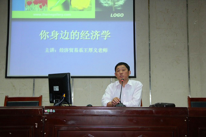 5月7日晚,经济贸易系王厚义老师应邀在图文信息中心一楼报告厅作《你身边的经济学》的专题讲座。讲座由经贸系党总支副书记朱宜娟老师主持,相关专业500余名学生到场聆听讲座。