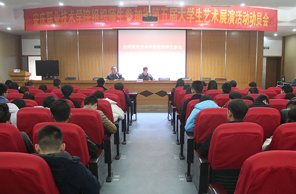 为贯彻落实省教育厅《关于举办安徽省第五届大学生艺术展演活动的通知》文件精神, 12月7日下午,我院在图文信息中心三楼学术报告厅召开参加省第五届大学生艺术展演活动动员大会。副院长毕明生出席会议并讲话。办公室、教务处、财务处、学生处(团委)、总务处、保卫处、公共基础部等部门负责人,以及各系党总支副书记、团总支书记、我院相关艺术类教师、各社团负责人近100余人参加会议。
