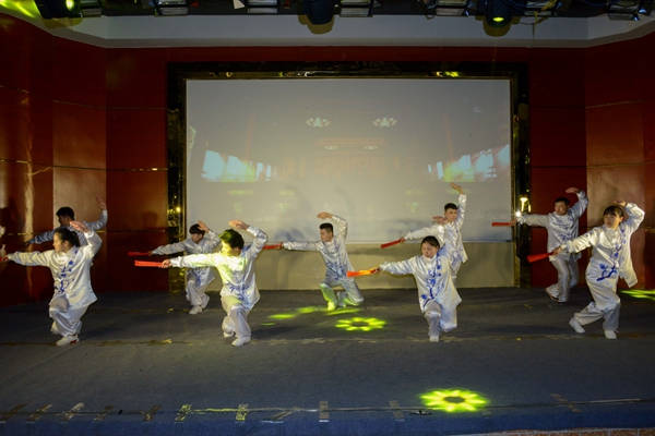 本次晚会以“砥砺拼搏绘愿景,携手奋进新时代”为主题。院工会老师们的一首《我们走在大路上》,唱出了我院近年来取得的辉煌成就和快速发展以及师生情谊;歌曲《只有音乐才是我的解药》、《美丽的心情》、《音乐串烧》等轮番登场,师生分别演绎经典,或浪漫温馨、或轻快悠扬、或活泼动感;原创小品《朋友圈》以小见大,既讽刺现代社会网络环境的混乱,又向同学们传递出满满的正能量;教师戏曲表演《陈州怨》选段《一弯新月挂半天》淳朴流畅,黄梅徽韵一览无遗;戏曲文化源远流长,功夫文化也不遑多让,学生们带来的《功夫秀》可谓是嗨翻全场,灵动活泼的舞狮、松张有驰的功夫扇、刚勇凶猛的格斗拳无一不让观众们起身呐喊,激动不已。整场晚会流行与古典兼收,温情与火热并举,形式多样,精彩纷呈。