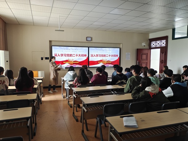 团总支书记唐玲老师带领同学们学习了二十大金句、二十大报告中引人关注的新提法以及“数”读二十大。党的二十大是在全党全国各族人民迈上全面建设社会主义现代化国家新征程、向第二个百年奋斗目标进军的关键时刻召开的一次十分重要的大会,而大会的胜利召开更是为广大青年指明了前进的方向。深入学习贯彻党的二十大报告精神可以更好地引领团总支学生会同学在平日学习工作中坚定不移听党话、跟党走。