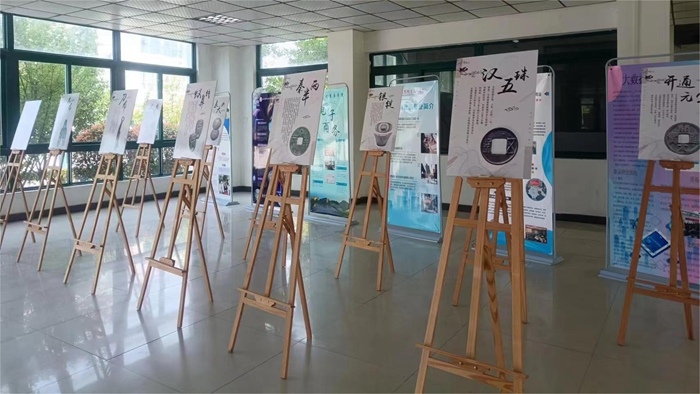 第三个展区为我院电子商务专业学生制作的大数据与会计、市场营销、工商企业管理、跨境电子商务和物流管理等专业的宣传海报。海报的排版和设计充分展现了同学们对专业设置的理解程度和专业技术水平。第四展区为中国古代货币展,在货币展中,学院学生选取了中国九个朝代共十二种不同品类货币进行陈列展示,从最早的贝币到如今的人民币。讲解学生通过文字讲述和模型展览,让前来观展的领导们近距离了解到中国古代货币的演变过程,同时感受到不同年代货币背后承载的的历史文化内涵。