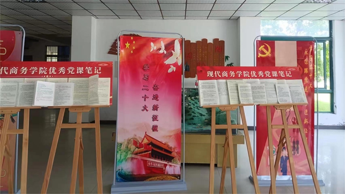 第二展区为学院第32期党课学员优秀党课笔记和党建海报展区。一份份精美的笔记,条理清晰、内容完整、字迹工整,记录了学员们在党课培训中的真实学习历程,对课堂知识的理解和领悟,展现出党课学员们认真严谨的学习态度和学习作风。