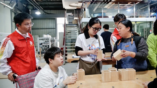 参观最后一站来到建筑工程学院实训厂房,进入厂房映入眼帘的就是建工学子们的手工作品和写生习作,沐阳之家的孩子们对此表示出极大的兴趣和好奇心,纷纷拿出手机拍照纪念。对于此次沐阳之家的到访,建筑工程学院的老师们也提前为这些孩子们准备了一份礼物,利用实训木工坊的机器制作了一批木头笔筒,沐阳之家党支部书记张玲老师表示,十分感谢威尼斯官网对于沐阳之家孩子们此次参观活动的重视,这些制作精良的笔筒后续还可以发挥孩子们的想象力的创造力进行二次艺术创作。
