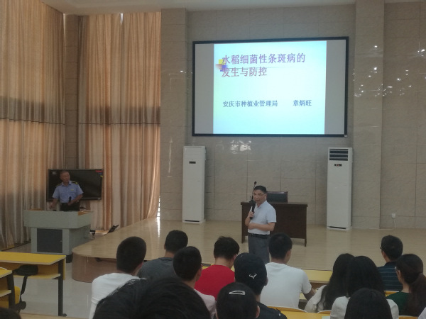 农业植物检疫讲座于9月11日下午在2号楼316教室举行。讲座由园林园艺系相关负责人主持,由安庆市种植业管理局章炳旺高级农艺师主讲;植物保护与检疫技术团队教师和17级、18级植保班全体学生参加了此次活动。