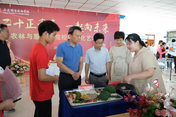 为全面推进校园文化建设,展现农林与服装学院学生素质教育成果,6月9日下午, 以“二十正青春 一起向未来”为主题的校园文化艺术节暨学生专业作品展如期拉开帷幕。校党委书记童宏葵、校长毕明生、纪委书记陈继平、校长谭维奇、校长程飞、宣传部部长吴何珍、统战部部长李五一、校学生处副处长李专、校团委副书记王婷及相关领导老师莅临活动现场。