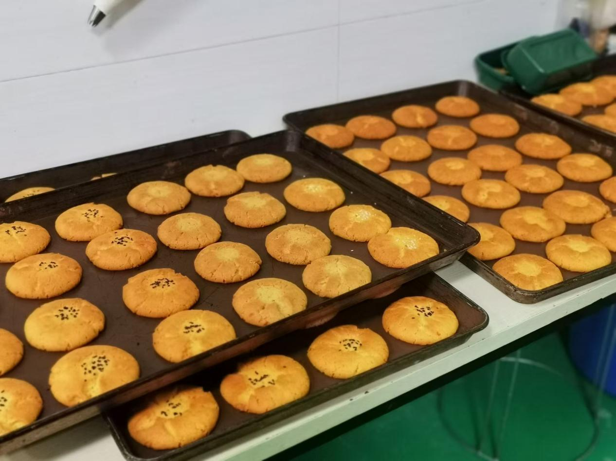 在合作过程中,师生团队针对麦陇香的传统招牌产品——桃酥和绿豆皇进行了改良和创新。他们经过多次配方调整与口味测试,成功研发了咸蛋黄味桃酥、五黑桃酥以及陈皮味绿豆皇等三款新品。咸蛋黄味桃酥巧妙地将经典桃酥的酥脆口感与咸蛋黄的浓郁风味相结合,为传统桃酥带来了全新的味觉体验。五黑桃酥则选用黑芝麻、黑豆、黑米、黑枸杞、黑桑葚五种黑色食材为原料,旨在打造一款既美味又健康的养生糕点,符合现代人追求的健康饮食趋势。陈皮味绿豆皇则是在传统绿豆皇的基础上加入了新鲜陈皮的清新香气。