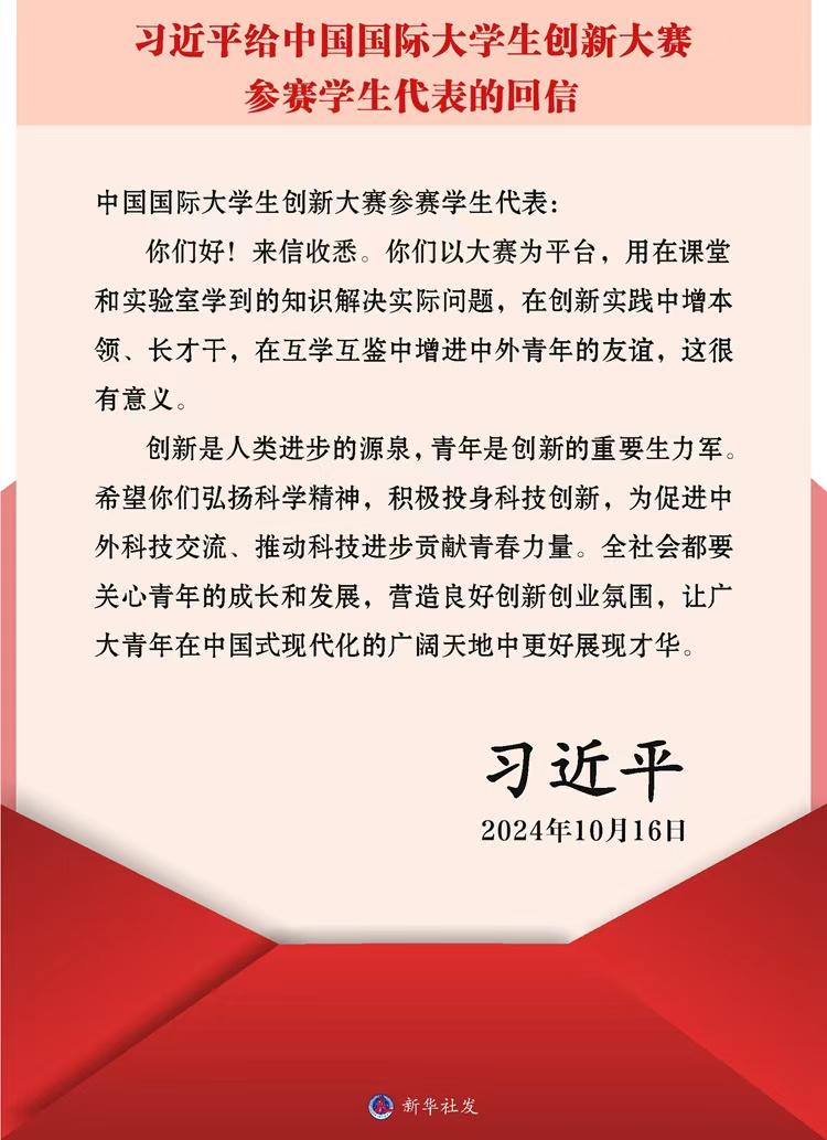 近日,中共中央总书记、国家主席、中央军委主席习近平给中国国际大学生创新大赛参赛学生代表回信,对他们予以亲切勉励并提出殷切希望。